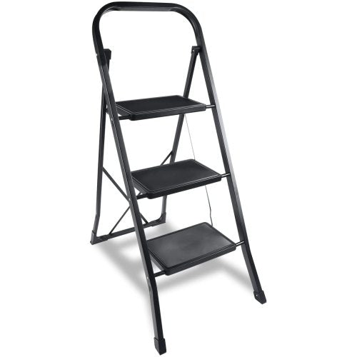 - [BETTER SIZE] Safety Folding 3 Step Steel Ladder with appropriate sizes which suit your needs. Open sizes: 18.3" x 28.7" x 40.9"; Folded sizes: 46.8" X 16.5" X 1.9", Net weight: 13 pounds, Maximum Load: 330 pounds.