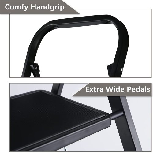 - [SKID RESISTANCE] The 3 step ladder has non-slip rubber handgrip making the stool easy to climb and carry. Wide pedals with non-slip rubber pattern offer heel-to-toe foot support. Big rubber feet fully touch the ground to stays firmly and prevent floors from scratches. (NOTE: Improper use of rubber feet will cause the step ladder to shake left and right. Please make sure that the rubber feet are in full contact with the ground.)