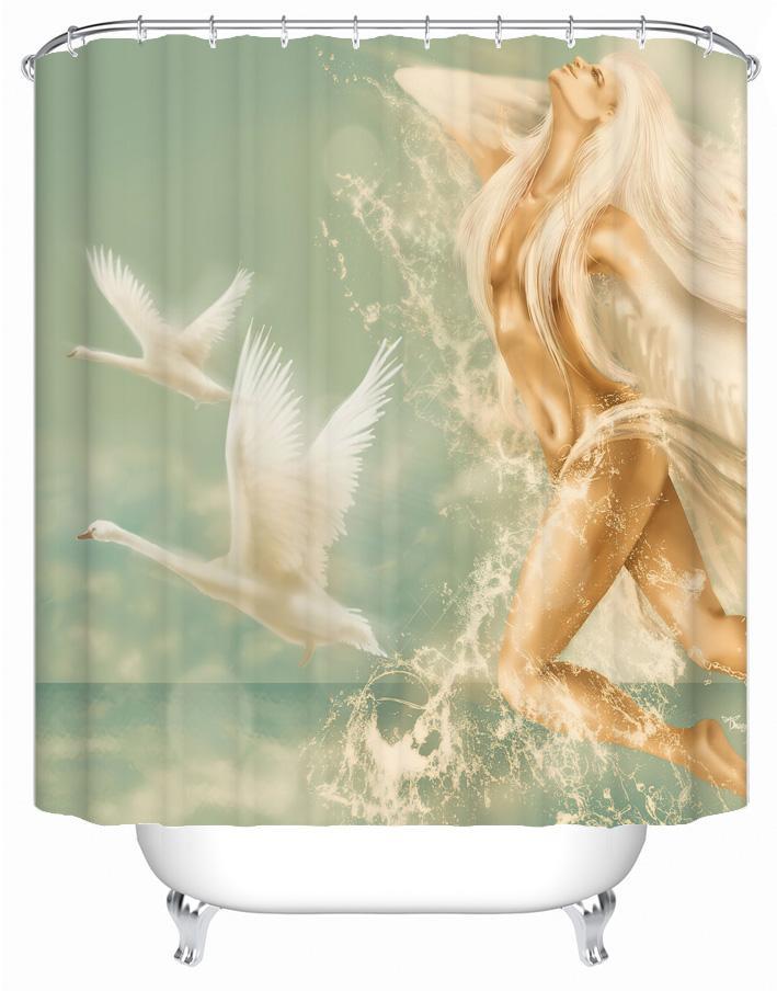 There is something so peaceful about this shower curtains print. The beautiful painting of goddess lady along with the flying swans and features blue and turquoise background colors provide a special feeling. Well-fit to neat and clean bathroom style.