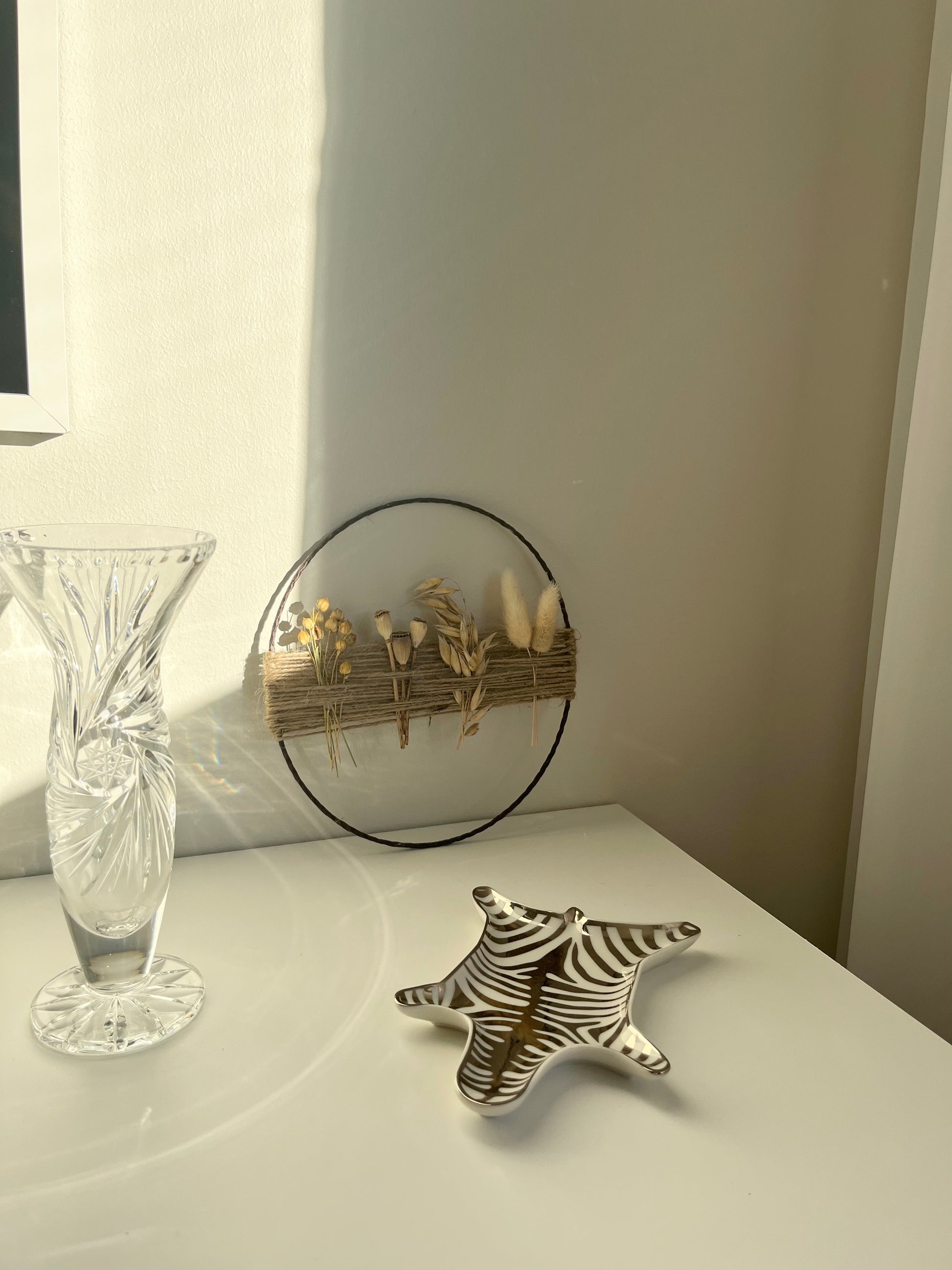 A metal ring wrapped with jute cord and decorated with a different beautiful natural dried flowers. Suitable for wall or window. It gives every room a very special atmosphere. Suitable for all seasons. The ring has a diameter of 20 cm and is provided with a cord for hanging.