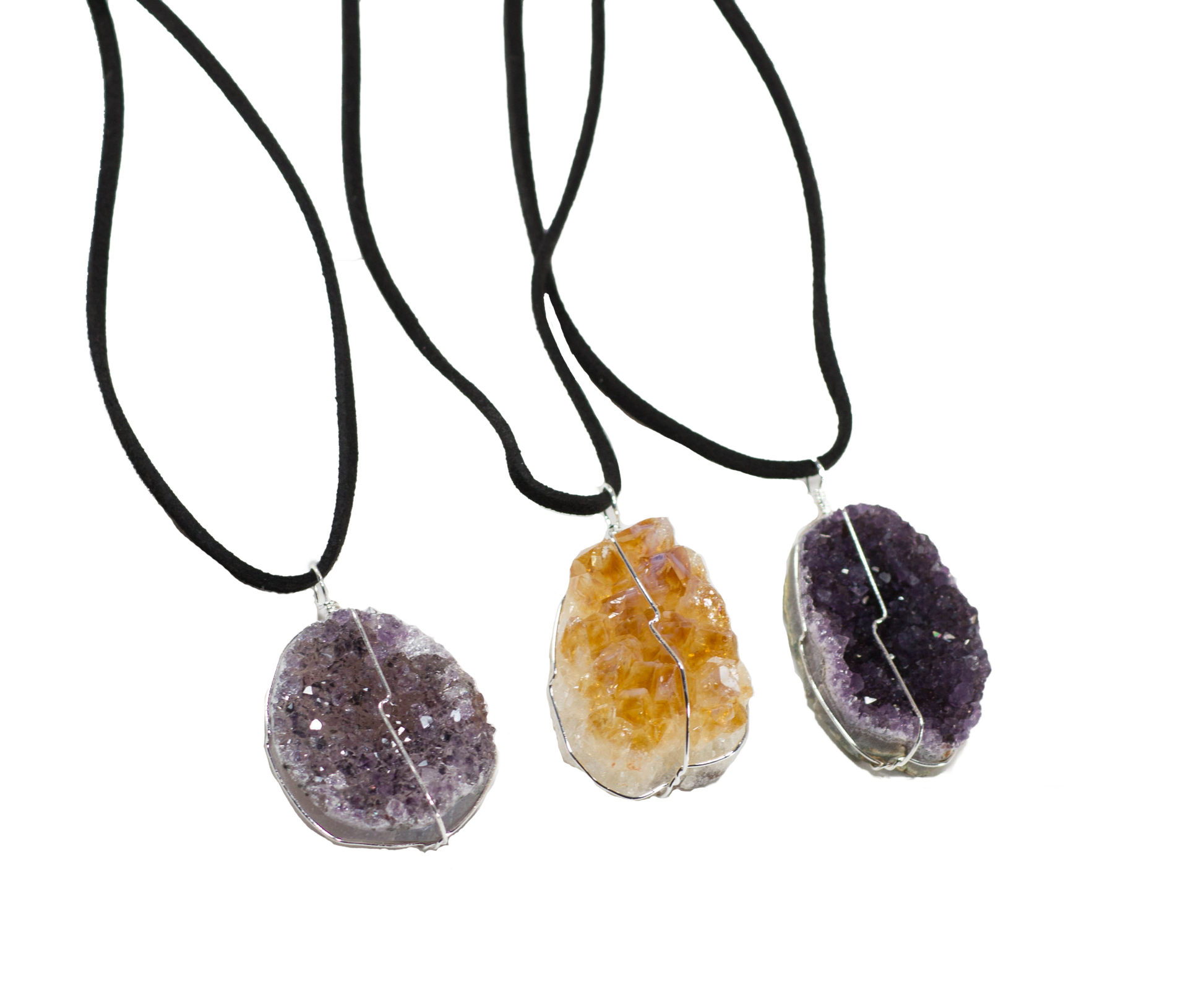 These round druse crystal specimens are securely held in place with silver wire and a leather cord. A vibrant addition to any outfit, druse crystals in amethyst, rose amethyst, and citrine enhance positive energy and dispel negativity. Wear these druse crystal pendants with other gemstone jewelry for a cohesive look.
