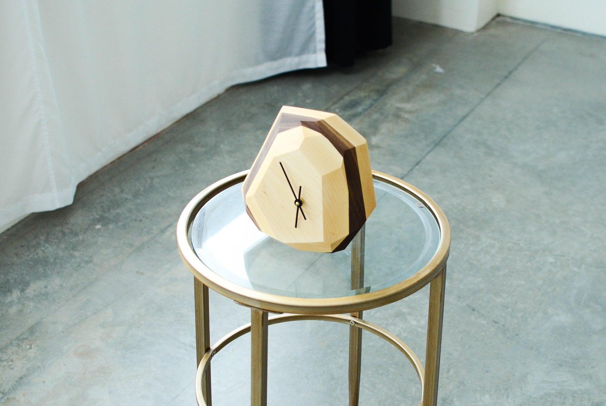 Display functional art in your home. This Modern and Minimalist clock offers an aesthetically clean way to bring time into your home. Built with 3 layers of American hardwood, this modern geometric wall clock is both edgy and elegant. Designed to resemble a large quartz crystal, this clock sits comfortably on a table or mantel, or hangs securely from the wall.