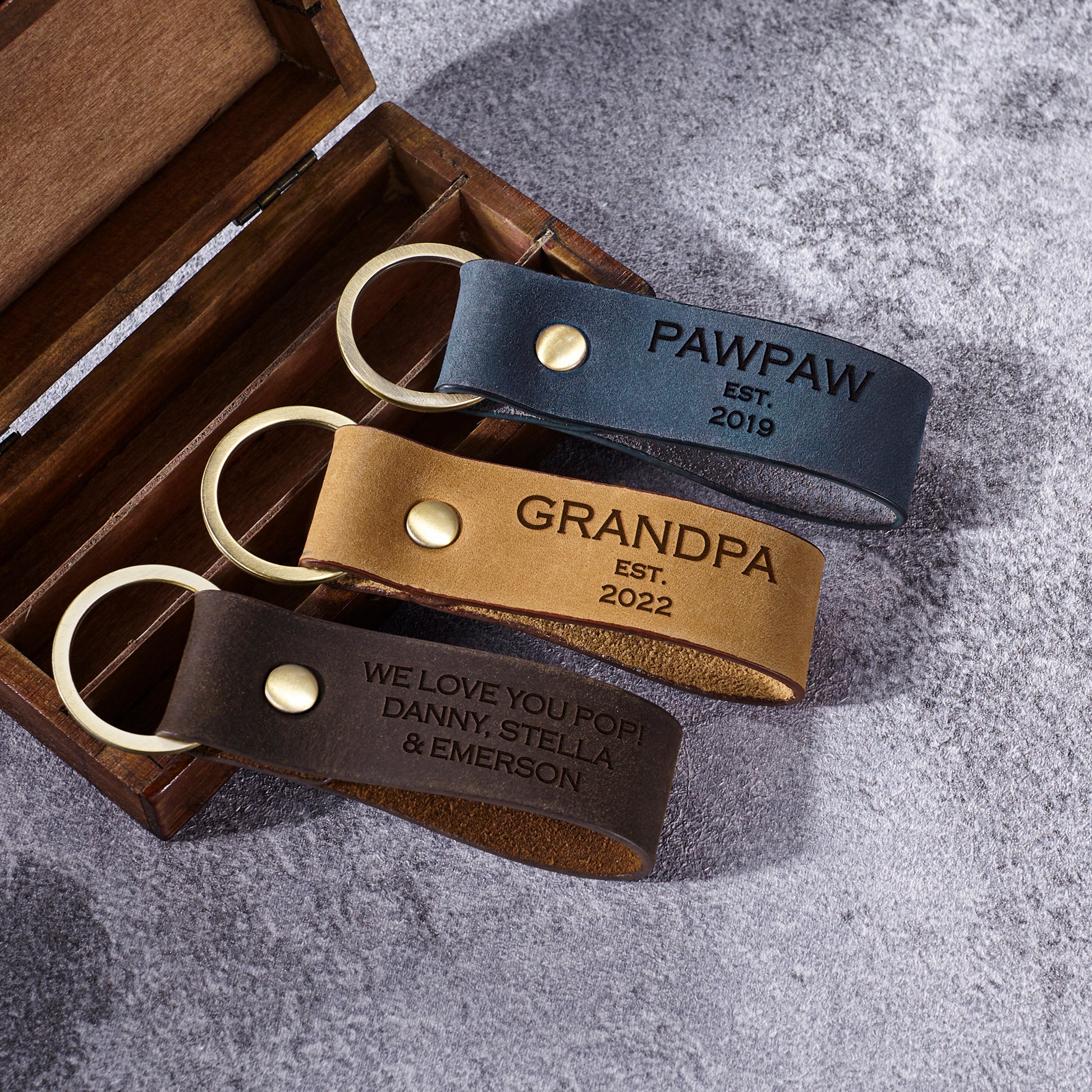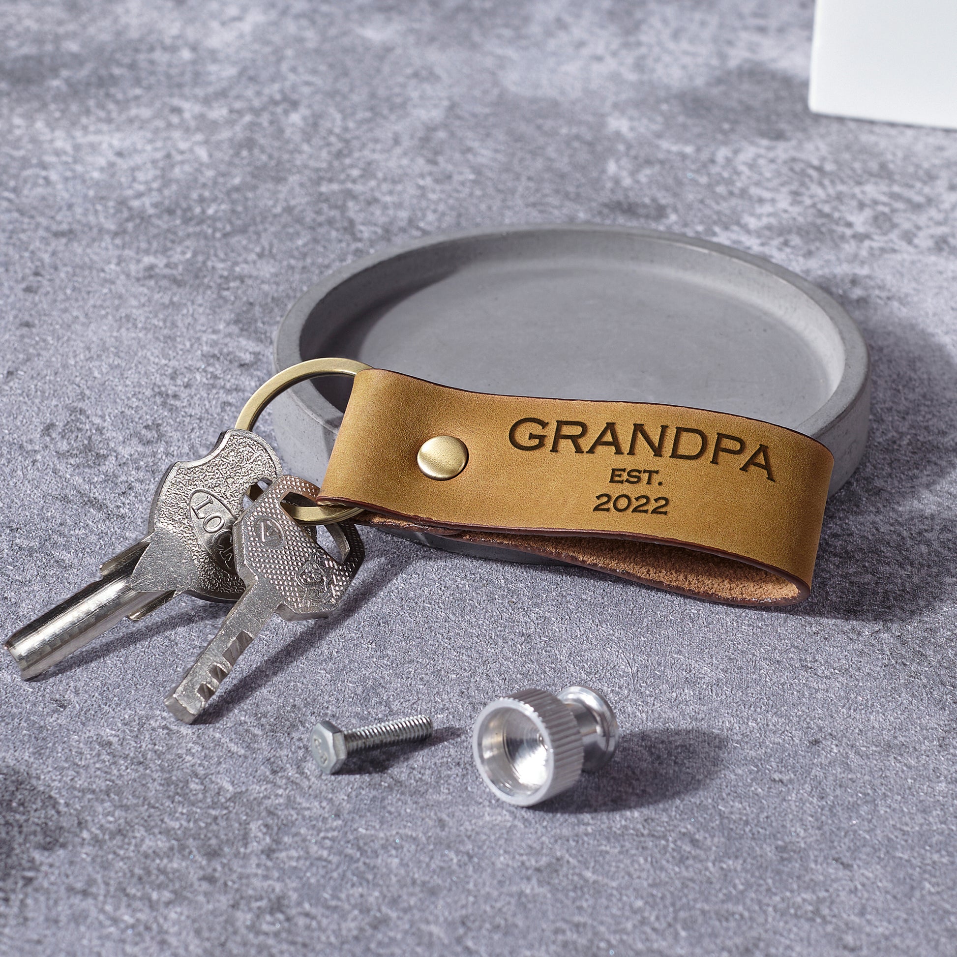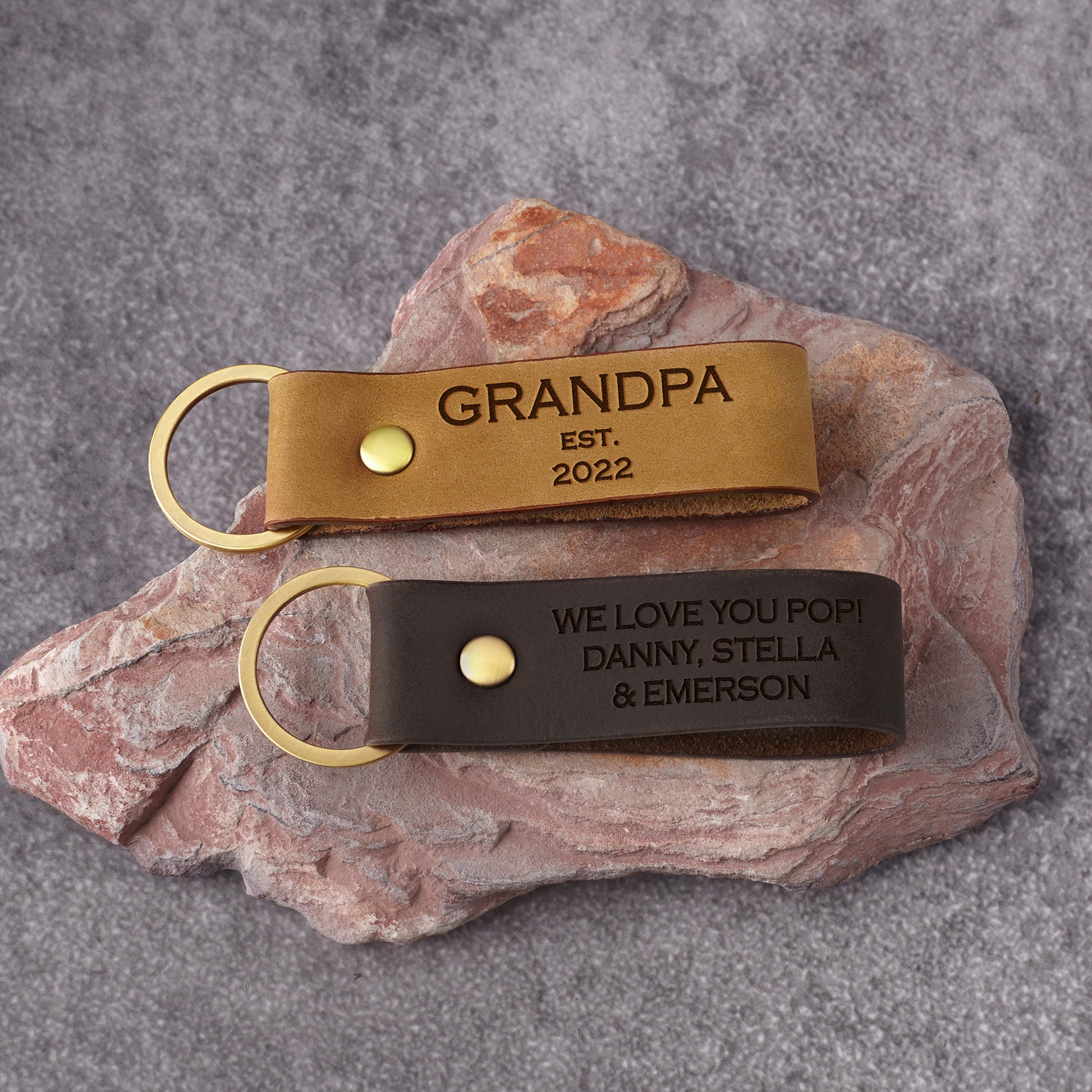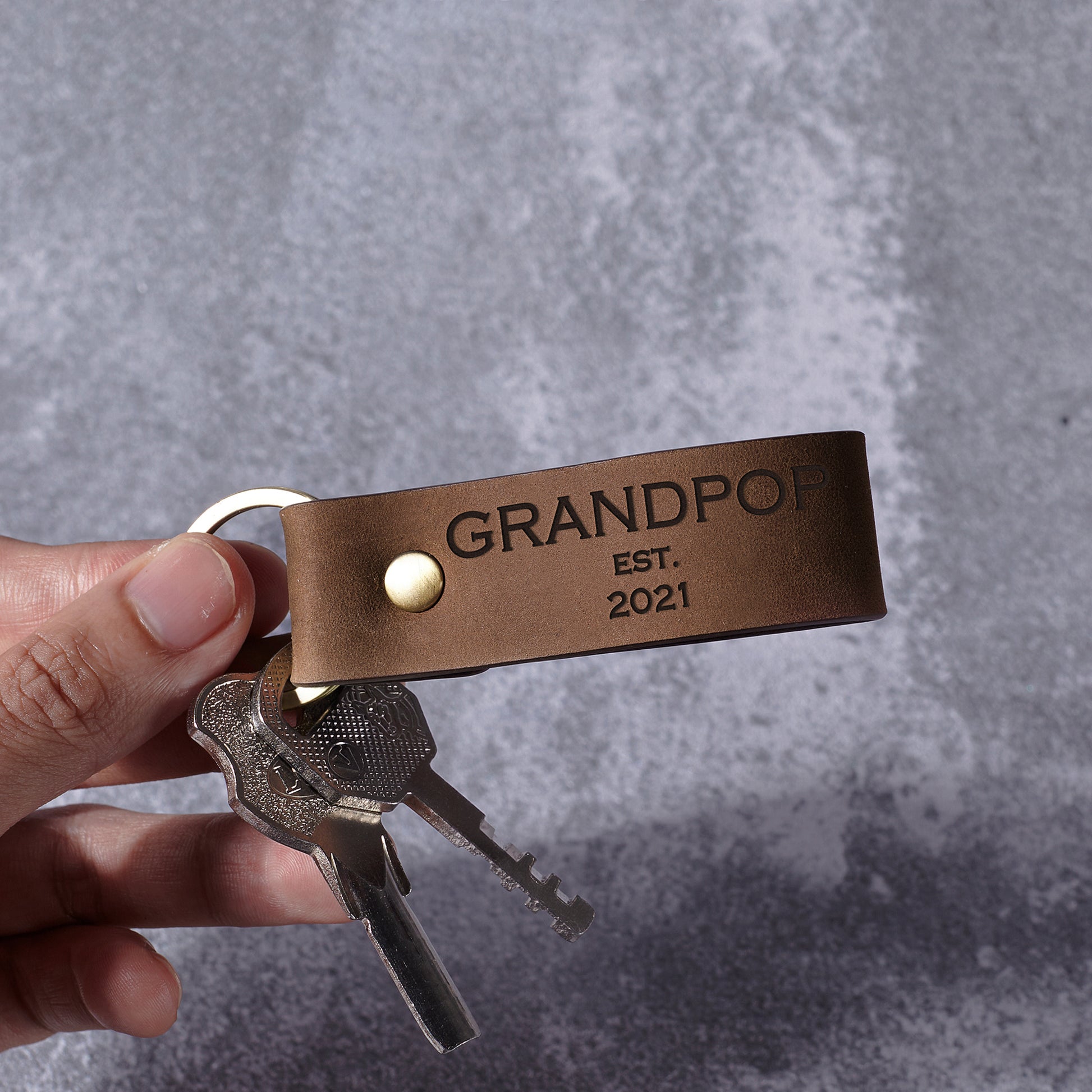 Please send us in the checkout note the following information: By default, the message on the front is "Grandpa est. + the custom year". But you can modify this however you want, just need to let us know. Leave a message (8-10 words) on the back (if any) Eg: One side: GRANDPA est. 2019 The other side: We love you!! • Word limit: 8-10 words/side ABOUT THIS ITEM This keychain is engraved with the phrase GRANDPOP est. [custom year] on one side. You can personalize the other side of this keychain with any custom phrase (if any), making it perfect as Gift for Grandpa at Christmas or a special day. P R O D U C T • I N F O ✅MATERIAL: Genuine Leather ✅DIMENSIONS: 3 3/8" x 1" ✅PERFECT UNIQUE GIFTS & PACKAGE: It's a perfect gift for yourself and your loved ones: your mother, friend, girlfriend, grandma, sister, wife, daughter on Anniversary, Birthday, Special Occasions, Christmas' Day, Wedding and much more! All of our jewelry are handmade from scratch and packaged with care in our workshop. Come in complimentary gift box. ✅SATISFACTION GUARANTEED: Each item is carefully handcrafted & undergoes a rigorous inspection process to ensure our products meet the highest possible standards. All engraving comes with a satisfaction guarantee.