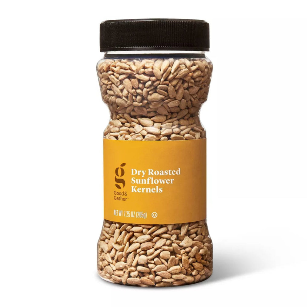 Satisfy your anytime snack cravings with the Dry Roasted Sunflower Kernels from Good & Gather™. Dry roasted to bring out the toasty and crunchy texture, these kosher sunflower kernels are seasoned to let you enjoy the yummy flavor. Great as a salad topping or anytime snacking on its own, these dry roasted sunflower kernels can also be incorporated into a wide range of recipes — add them to broccoli slaw and other dishes as a light garnish, mix them into homemade granola, or sprinkle them over baked veggies, tacos or breads to enhance flavor.
