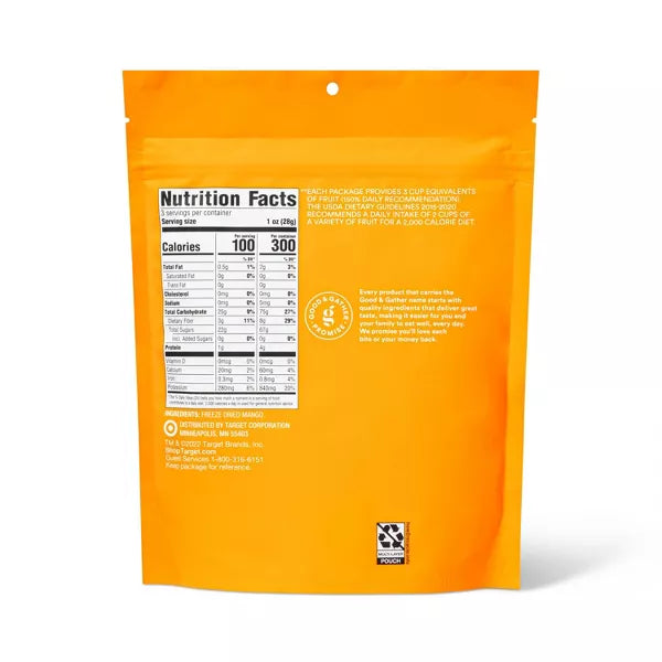 Discover a fresh new way to snack any time of the day with these Freeze-Dried Mango Slices from Good & Gather™. These flavorful mango slices come in a resealable, stand-up pouch so you can keep the slices fresh between snacking, and each pouch contains six servings of fruit for plenty of nutritional value. Freeze-drying removes water from the fruit, while preserving the flavor and nutritional value. They are Kosher and Non-GMO Project verified. These sweet mango slices taste great added to trail mix, cereal or yogurt, or straight from the bag. Add them to your meal or salad or take them with on a busy day for an on-the-go snack.