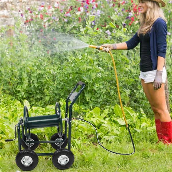Introductions:This heavy duty hose reels can hold 229 feet of 5/8 inch or 393 feet of 1/2 inch water pipe. This product is constructed with a tubular steel frame with a green powder-coated surface, which is durable and suitable for outdoor use.