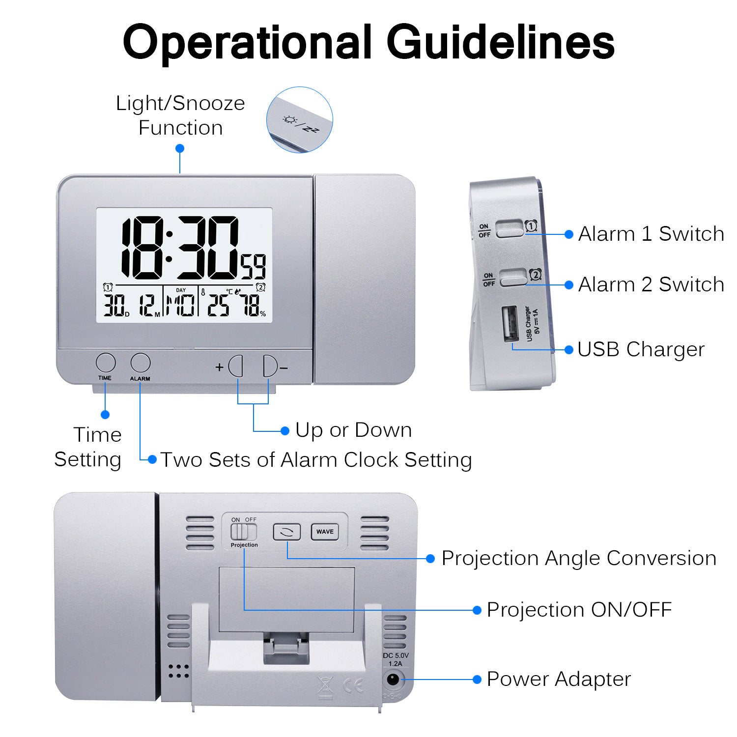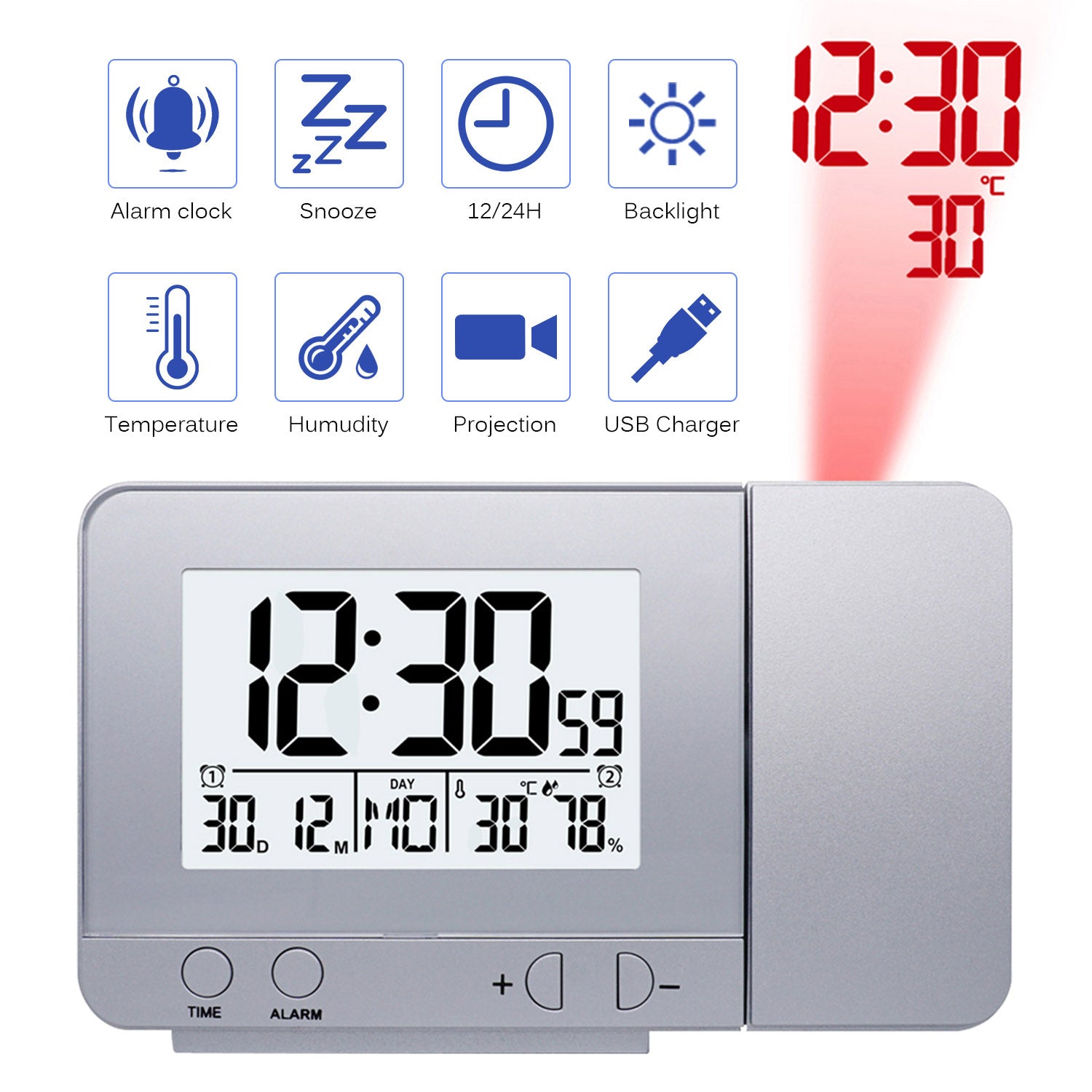Multifunctional Alarm clock show following functions: time, date, double clock, temperature, humudity,and etc.