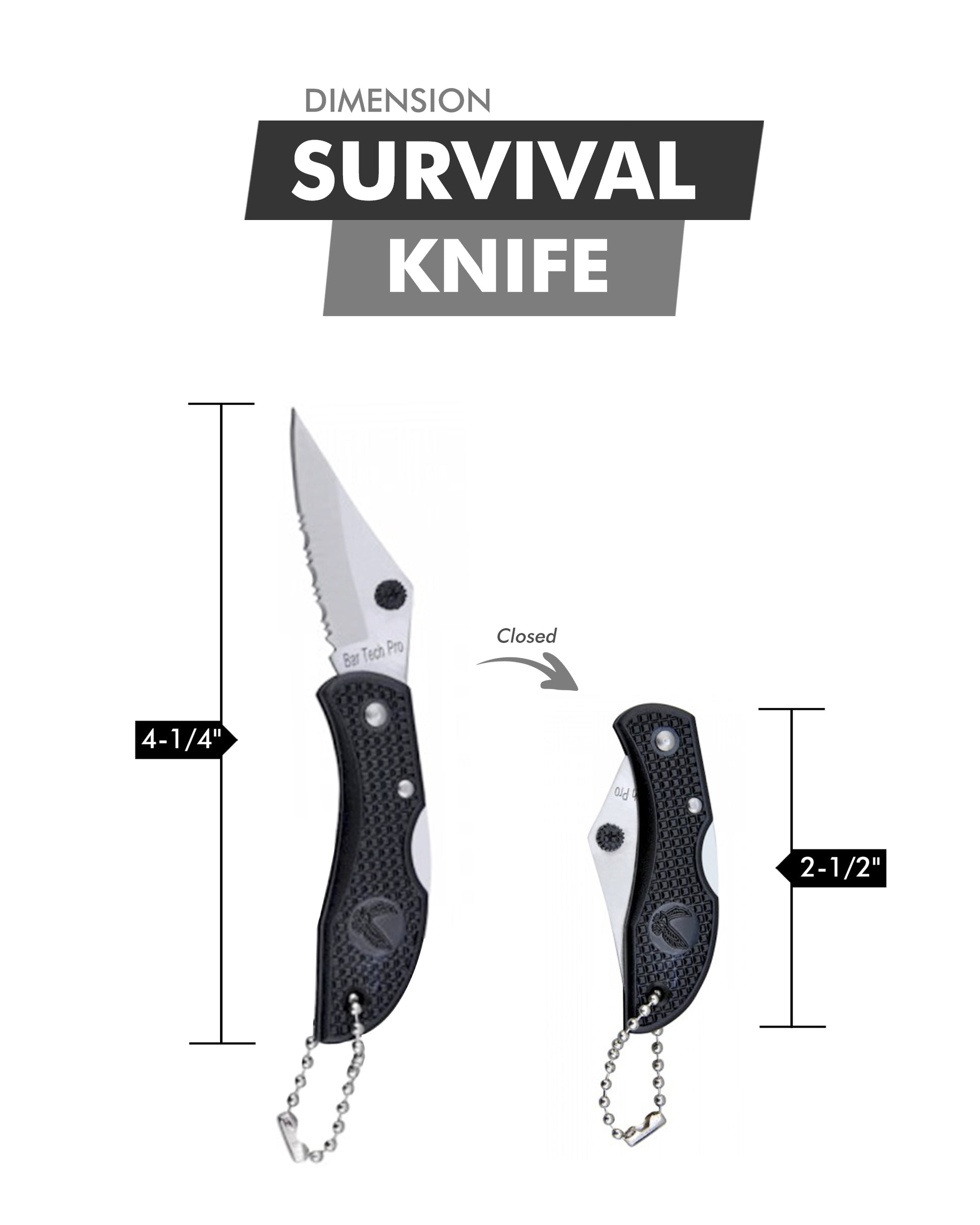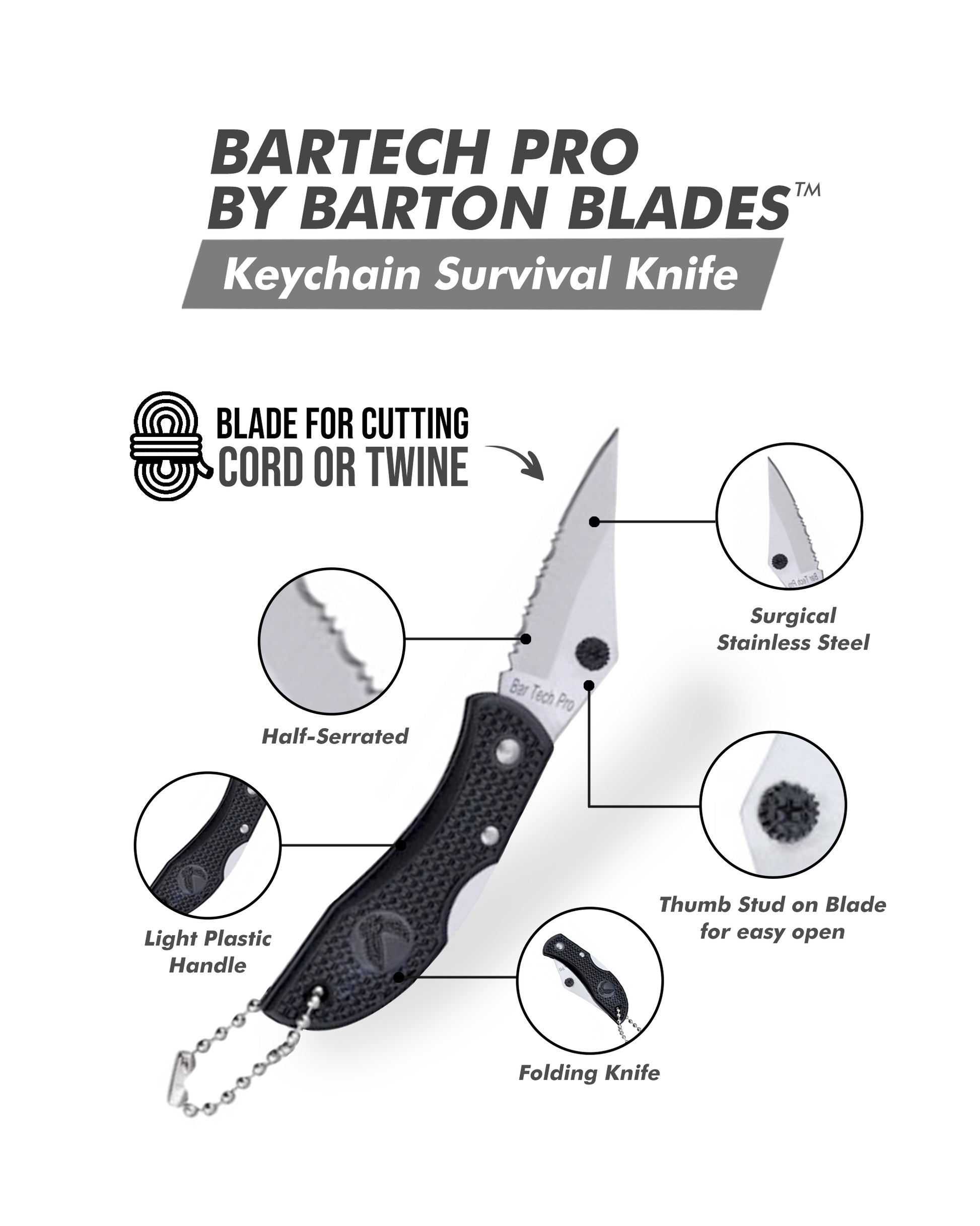 Lockback Knife on a Key Chain by Bartech Pro This handy little mini knife on a key chain features an extra sharp 1-7/8î 420 surgical stainless steel half-serrated blade to cut cord or twine easier and lightweight Leymar handle. The thumb stud allows one-handed opening with either the left or right hand. Measures 4-1/4" long opened and 2-1/2" closed. Lifetime warranty. Bulk Packed.