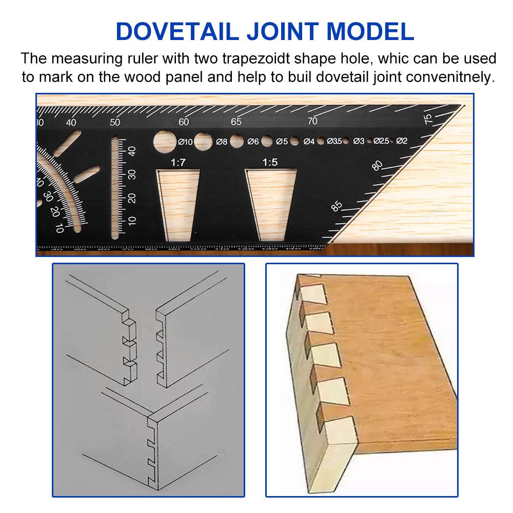 The measuring ruler with two trapezoidt shape hole, whic can be used to mark on the wood panel and help to buil dovetail joint convenitnely.