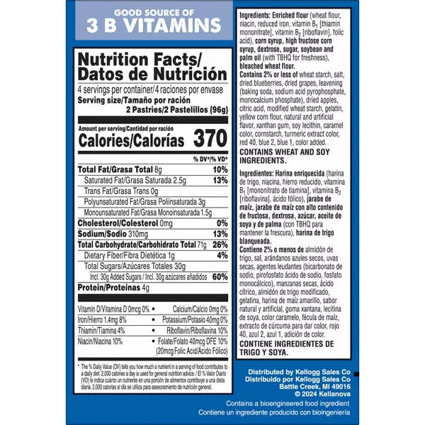 Pop-Tarts Frosted Blueberry toaster pastries are a delicious treat to look forward to any time of day. Jump-start your day with a sweet and decadent blast of delectable blueberry-flavored filling encased in a crumbly pastry crust, topped with yummy frosting and crunchy sprinkles. It makes a quick and tasty kids snack. Pop-Tarts toaster pastries are an ideal companion for lunchboxes, school snacks, and busy, on-the-go moments; Not just for mornings, the versatile deliciousness of Pop-Tarts fits into your lifestyle just about anywhere there's time for a snack. Store them in your desk drawer for a pick-me-up at the office, keep them on hand in your pantry for a sweet after-dinner treat, or even bring some in the car for a breakfast to go. Just pop them in your toaster for a crisp, warm crust, heat them in the microwave, or enjoy them right out of the foil with a glass of ice-cold milk.