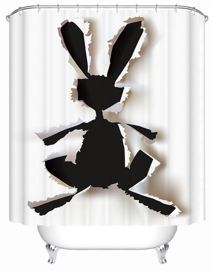 A funny display of a torn look alike shower curtain. The rabbit who run out of the shower, its cool and funny theme. Suitable for kids bathroom decor, cute "skipping a shower" figure. Black and white colors for appropriate fit to any bathroom design.