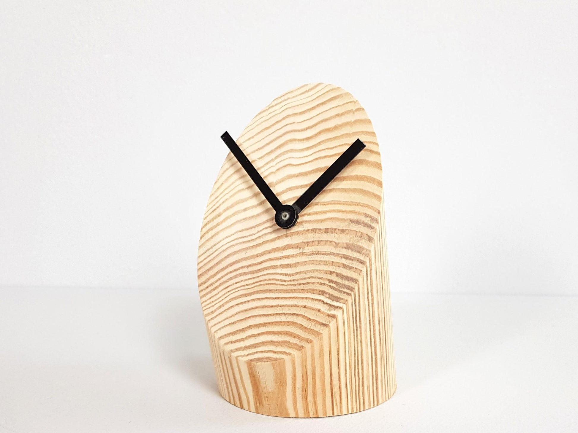 A clock that shows the wood grain. It is cut as a specific angle to ****** the grain **** is formed each year. Made from locally sourced pine wood.