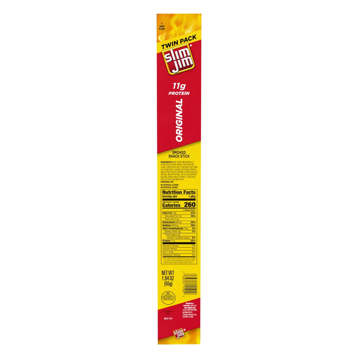 - One 1.94 oz Slim Jim Original Snack Sticks Twin Pack, meat snacks