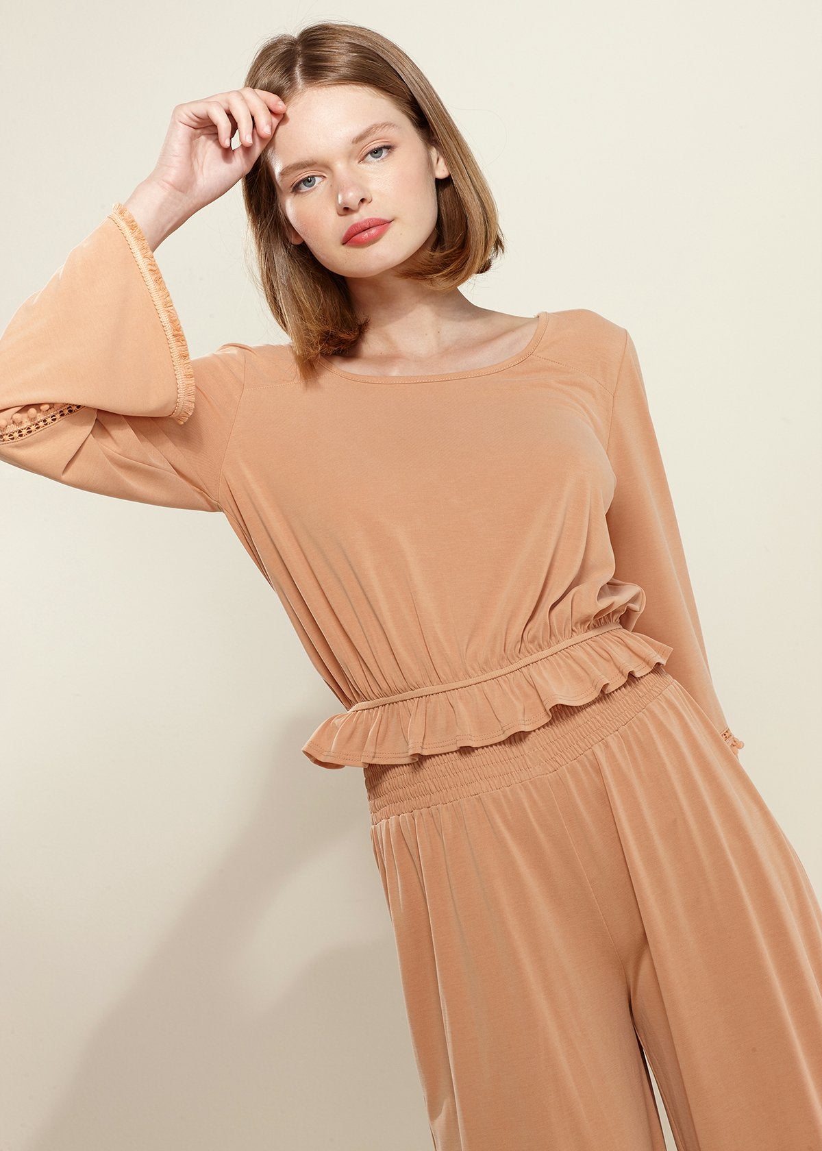 Smocked Waist Wide Leg Palazzo Pants in Apricot