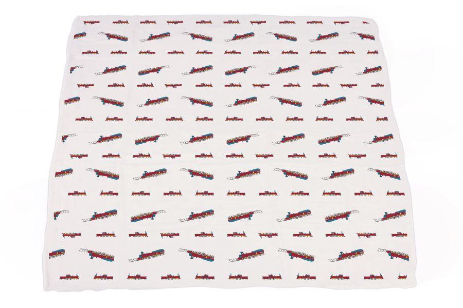 Vintage Steam Trains and Blue Stripe Bamboo Muslin Newcastle Blanket