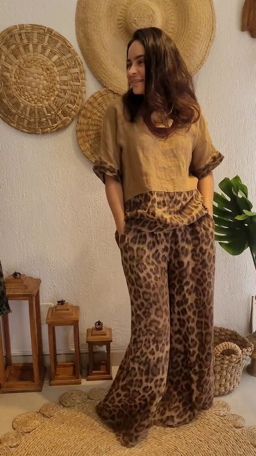 Women Clothing Loose Stitching Short Sleeve Top High Waist Wide Leg
