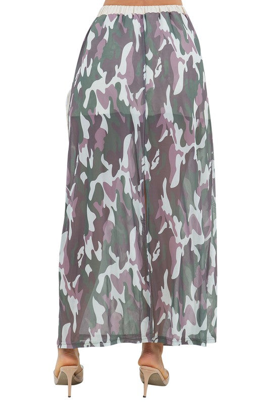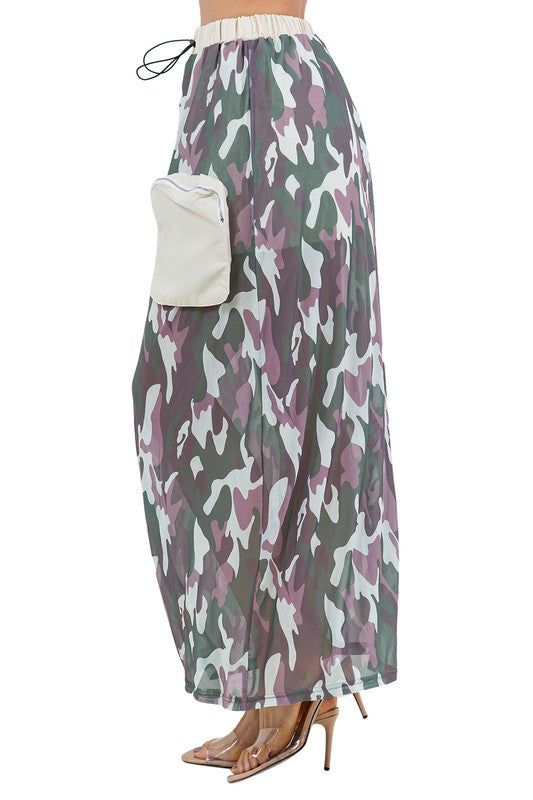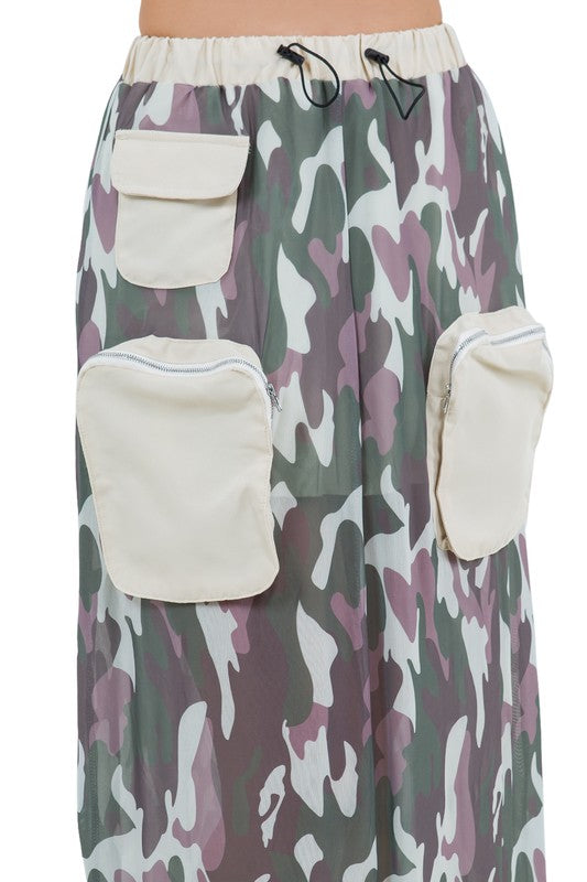 Details, long maxi skirt , cargo style ,elasticized waist mesh design