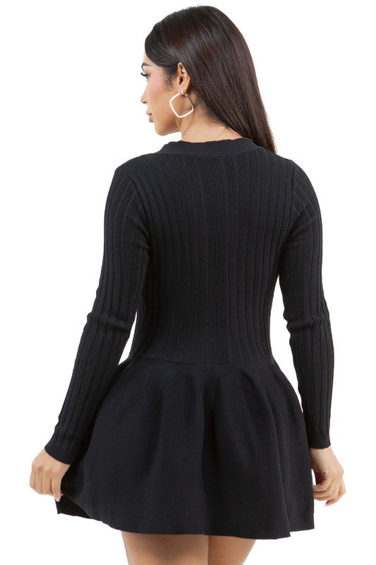 Fashion sweater babydoll dress, long sleeves, V-neck, front button look
