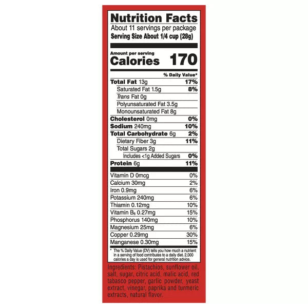 - FLAVOR: Chili Roasted - Turn up the heat with our Chili Roasted Pistachios. They're bursting with big, bold flavors of red pepper, garlic and vinegar to tingle your tongue and keep you craving more. They are perfect for cooking & great for snacking